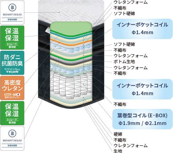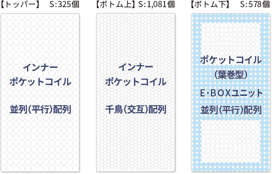 トッパー部分は羽毛布団の寝心地を表現するためインナーポケットコイルを採用。ボトム部分にはふんわり包み込む感触と安定したサポート力を併せ持つ葉巻型10巻きコイルとインナーポケットコイルを採用した寝心地は贅沢の極みです。