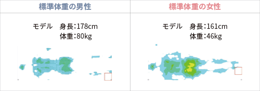 奏の夢にかかる体圧分布を視覚化。背中・腰の接地面が広く全体的に均一な色調を示しており、血行促進、筋肉の緊張緩和、腰痛や肩こりの軽減、睡眠の質の向上などが期待できます。